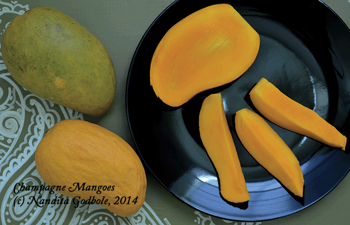 Champagne Mangoes: Top left, raw. Bottom left: ripe. Right: Ripe mango cut into wedges.